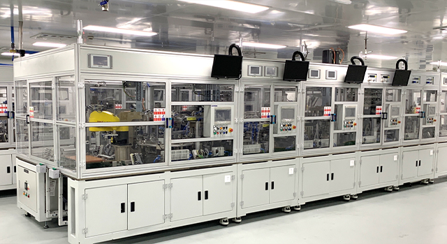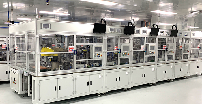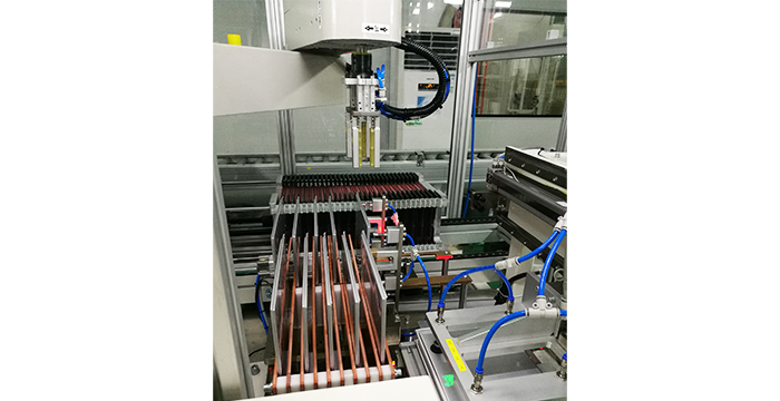 其二、鋰電化成分容生產(chǎn)測試系統(tǒng),覆蓋鋰離子電芯測試工序的全部工藝過程,實現(xiàn)注液電芯接收到電芯成品下線整個過程的全自動化生產(chǎn)。在倉儲物流系統(tǒng)的管理調(diào)度、安全、專機效率和系統(tǒng)柔性等多方面進行了優(yōu)化。自研的拘束工裝,對產(chǎn)品外觀實現(xiàn)了良好的保護,滿足了生產(chǎn)工藝的需求。并獲取了《一種兼容型軟包電池加電測試裝置》和《一種軟包鋰電池化成分容治具》兩項發(fā)明專利;