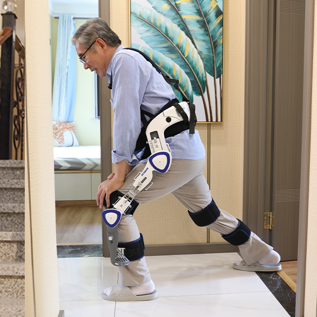 下肢可穿戴訓練器是一款可穿戴助行訓練設備,基于仿生原理進行設計,結合人體工程學,更加貼合下肢生理結構,舒適度強,同時增強膝關節穩定性。兼顧下肢弱能力人群的康復早期院內訓練與康復后期運動,激發患側肢體主動參與能力。產品利用鐘擺原理,無需電池能量供給,利用人體自身重力代替電機的驅動力,提升自然步態的行走效率,并伴有多檔位調節。使用本產品的用戶可獨立完成穿脫,無需他人協助,在家庭、社區等日常生活中使用非常便捷。